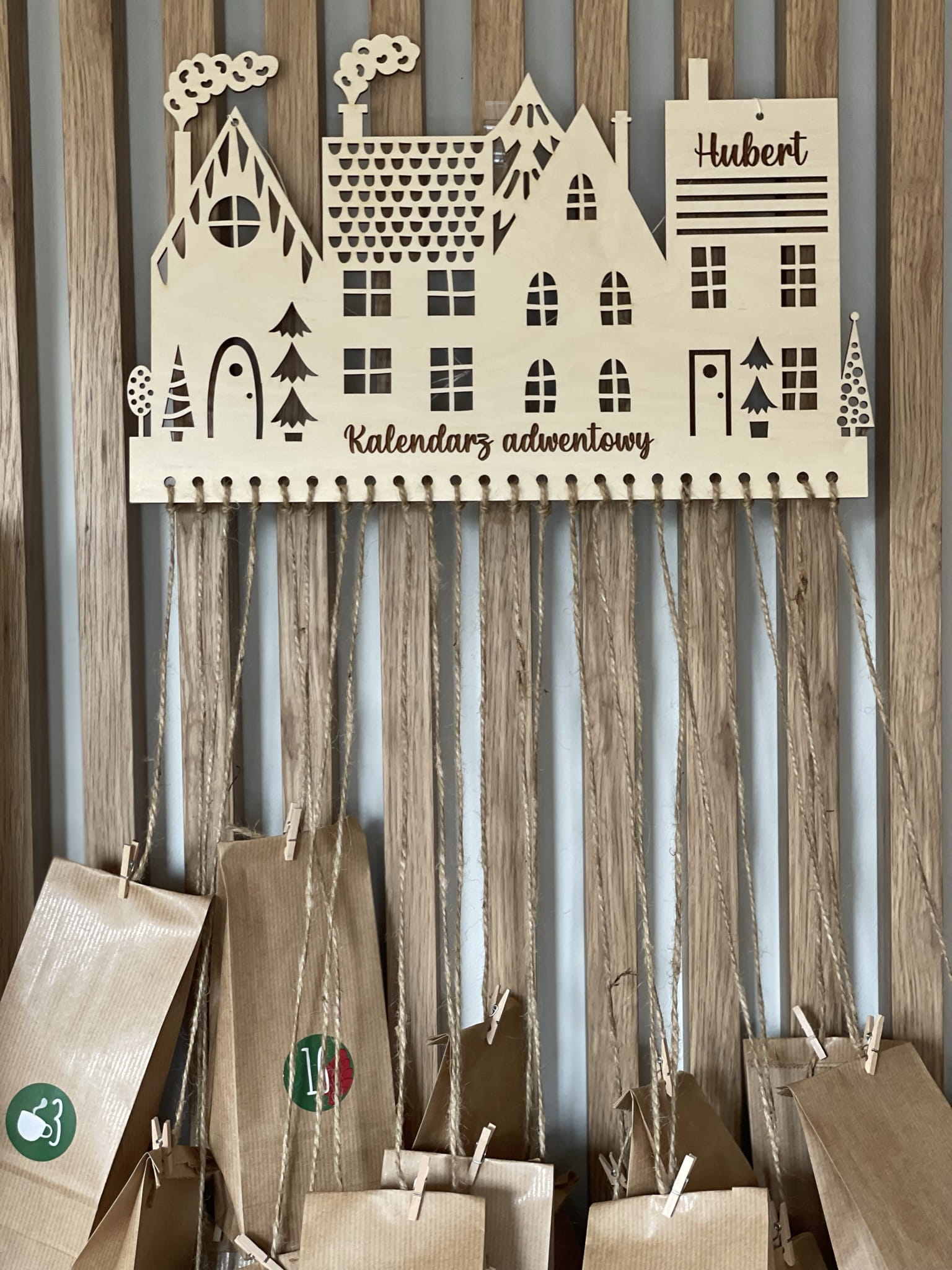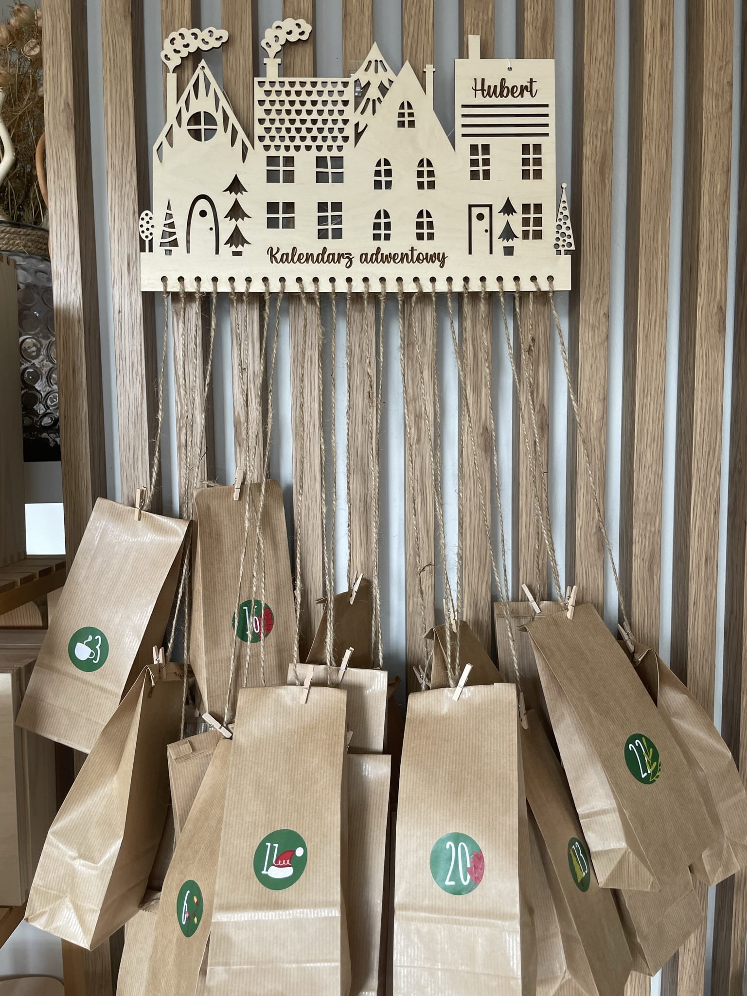 Po doczepieniu woreczków papierowych lub jutowych stanowi piękną całość kalendarza adwentowego.