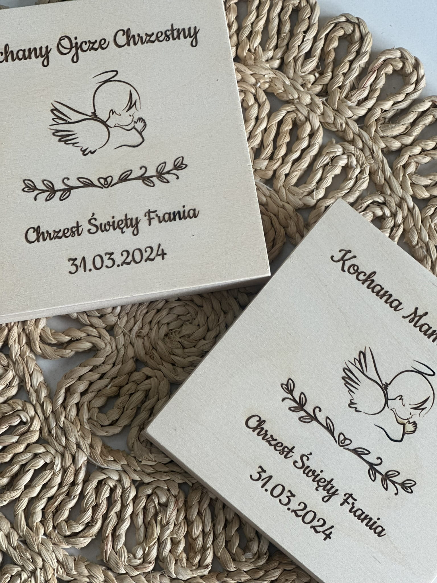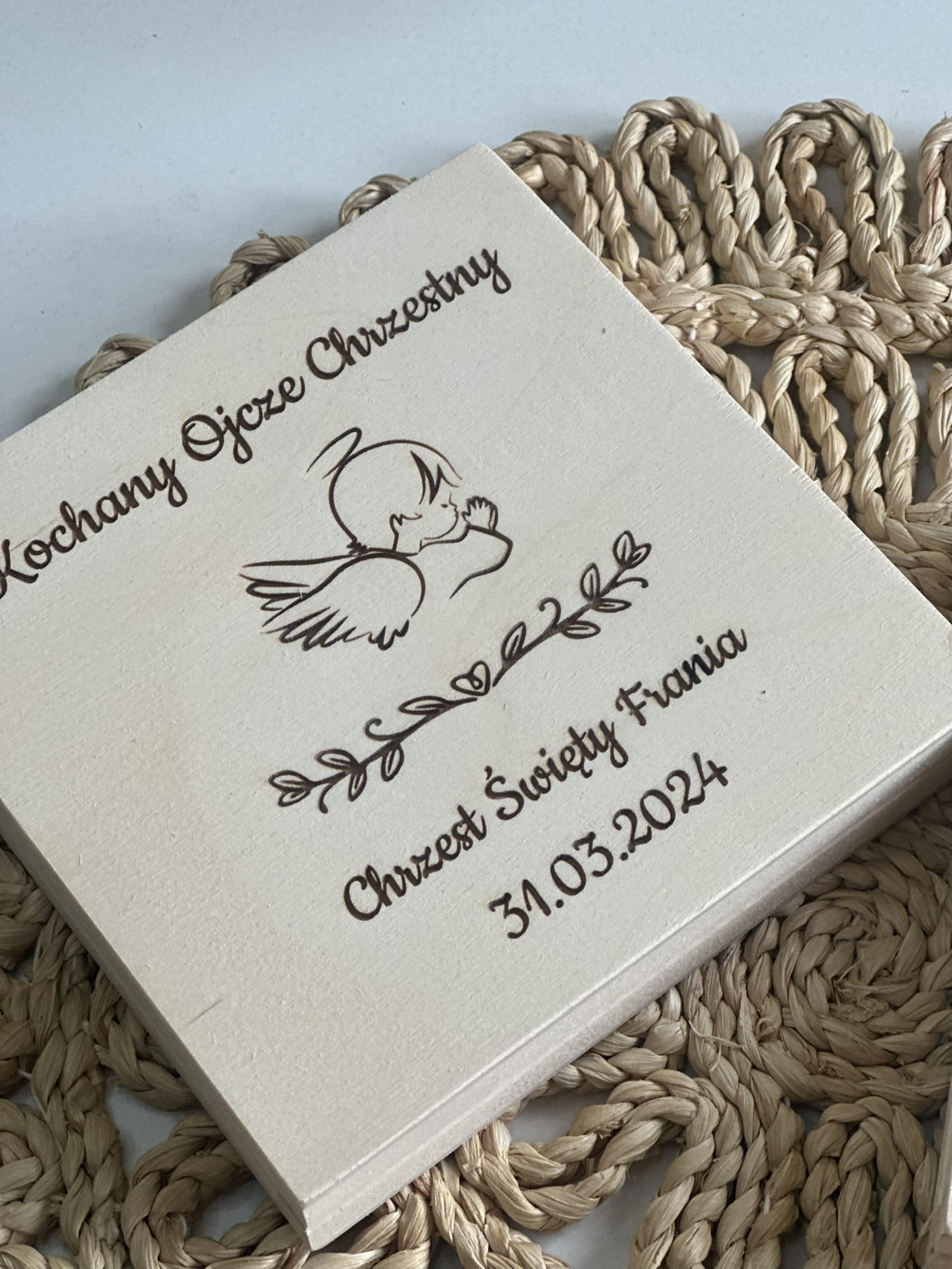 Na zewnątrz z aniołkiem oraz podpisem Kochana Matko Chrzestna / Kochany Ojcze Chrzestny oraz Chrzest Święty (imię dziecka) oraz data chrztu.