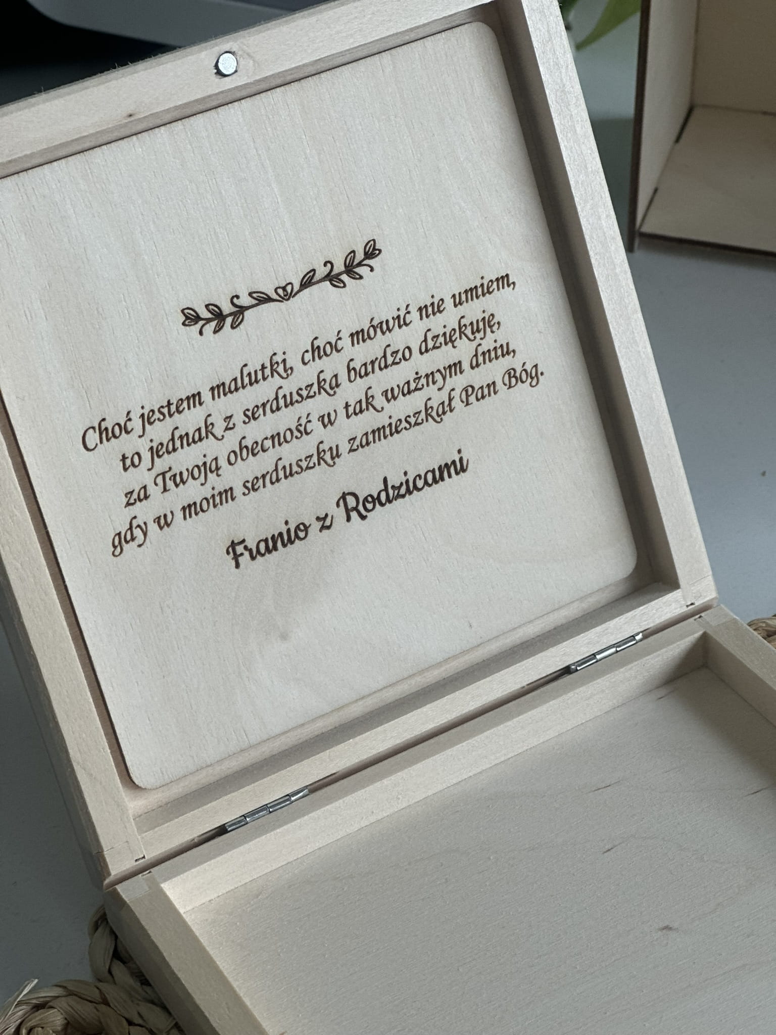 Piękne, drewniane pudełeczko jako podziękowanie dla Rodziców Chrzestnych, pomieści czekoladki, cukiereczki, zdjęcia lub inne drobiazgi :)
