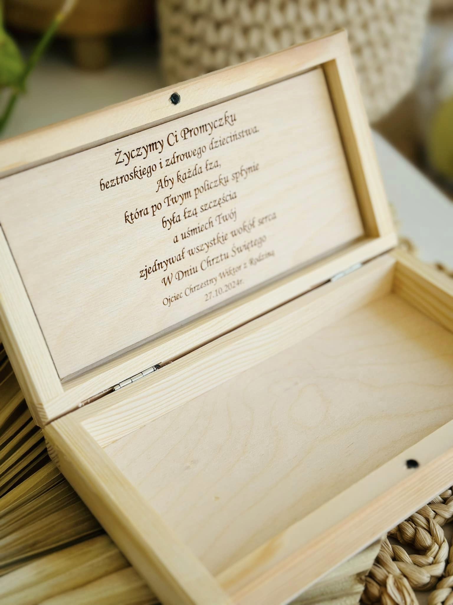 Przepiękne pudełeczko z dedykacją. W środku miejsce na pieniążki, można w nim również umieścić mały przedmiot np. łańcuszek lub kolczyki.