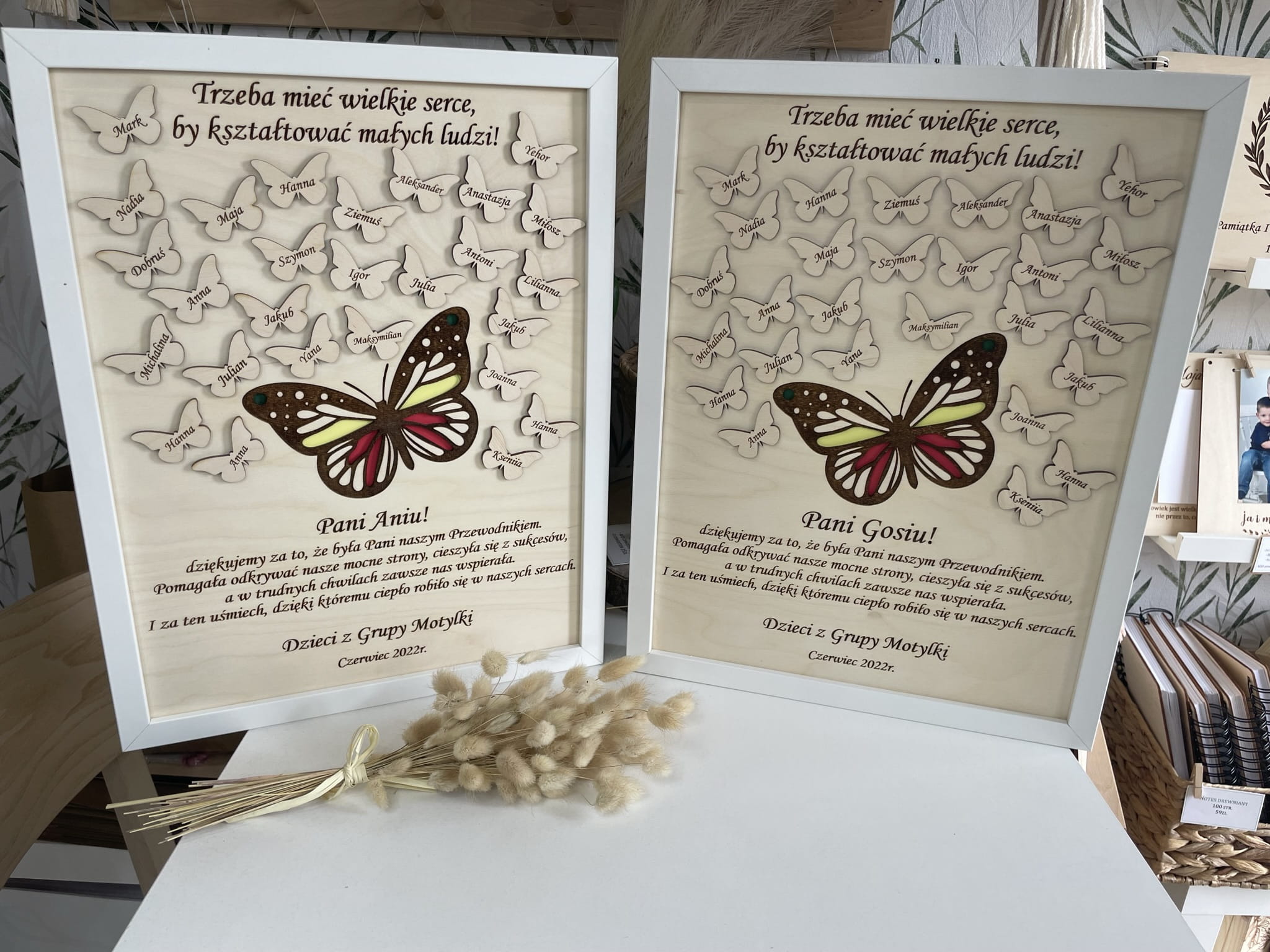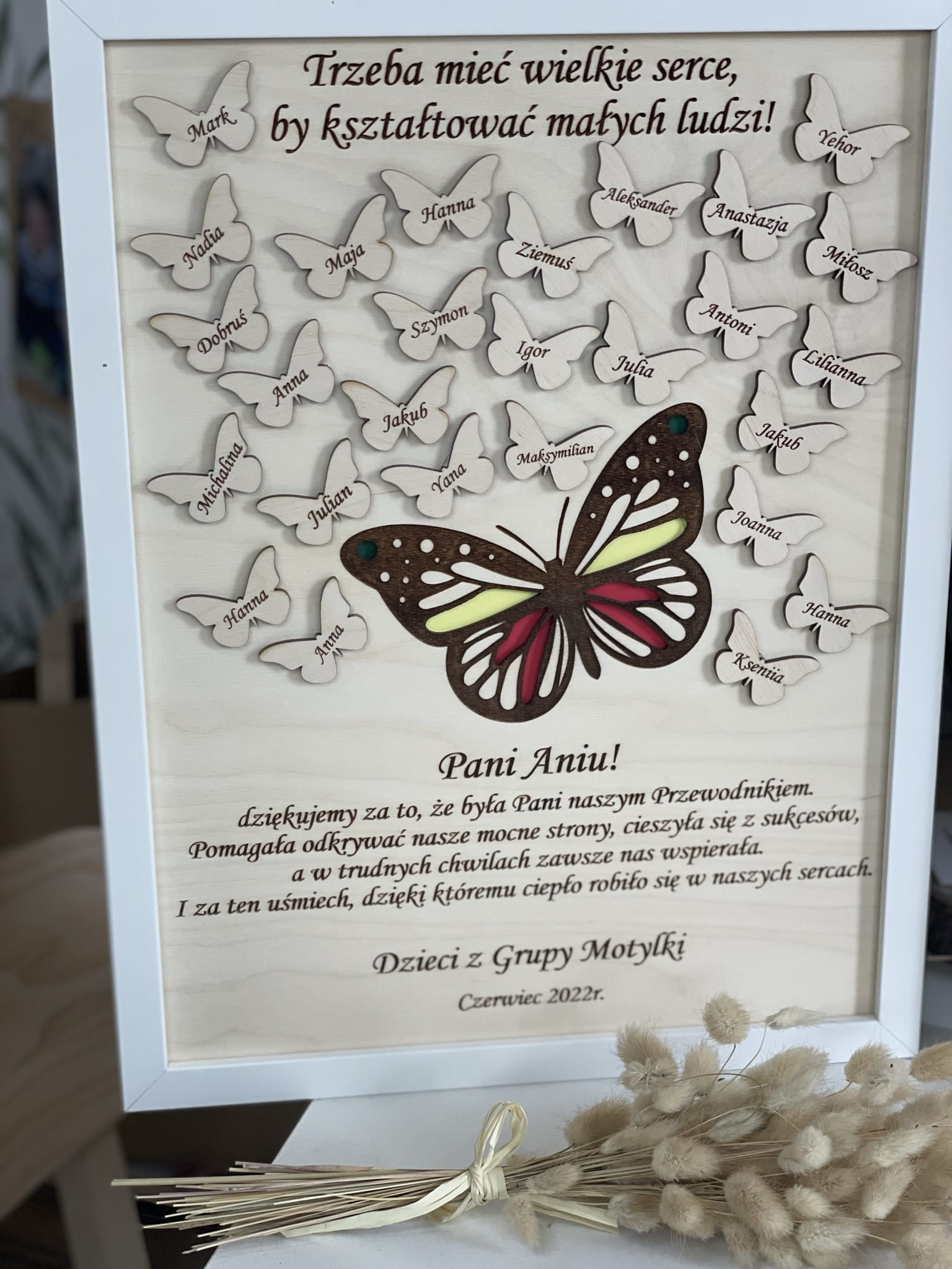Piękna, grawerowana ramka - z motywem kolorowego motyla - z imionami dzieci umieszczonymi na drewnianych, małych motylkach.