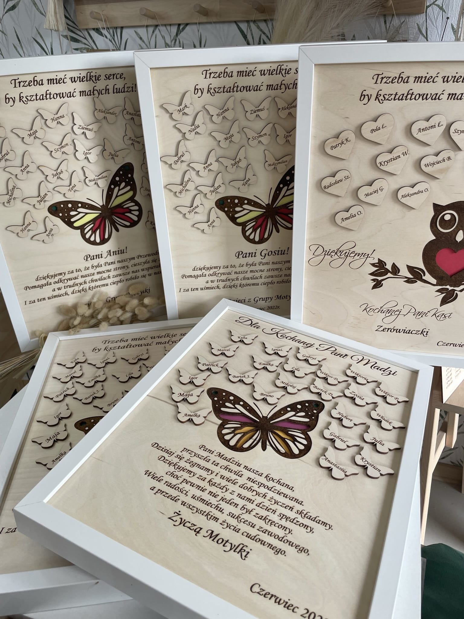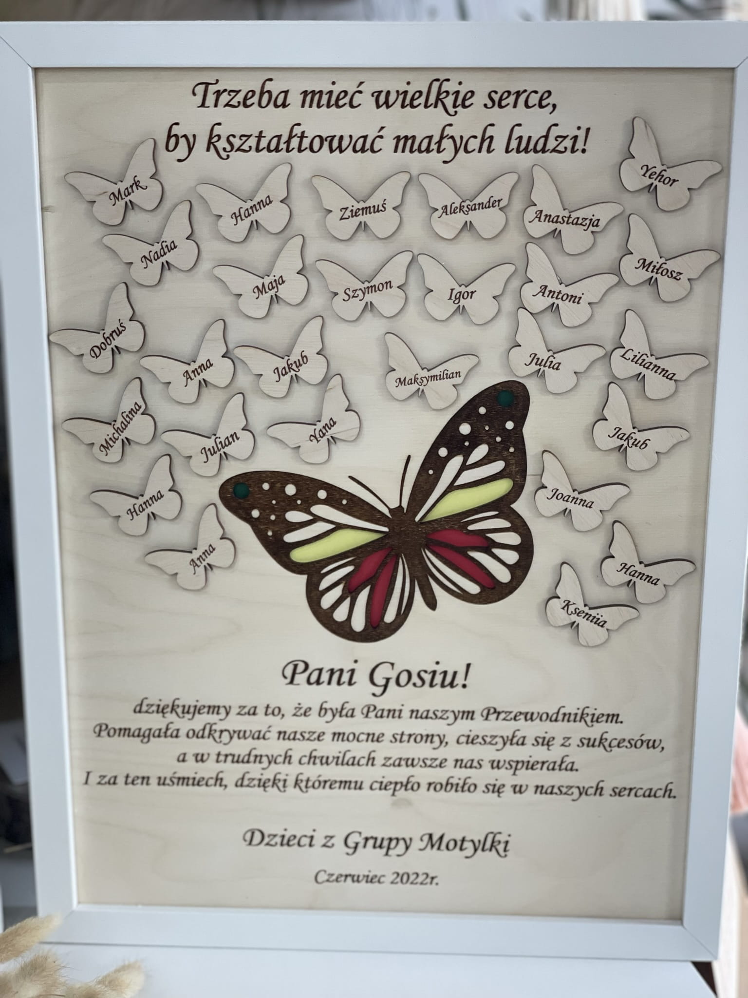 Piękna, grawerowana ramka - z motywem kolorowego motyla - z imionami dzieci umieszczonymi na drewnianych, małych motylkach.