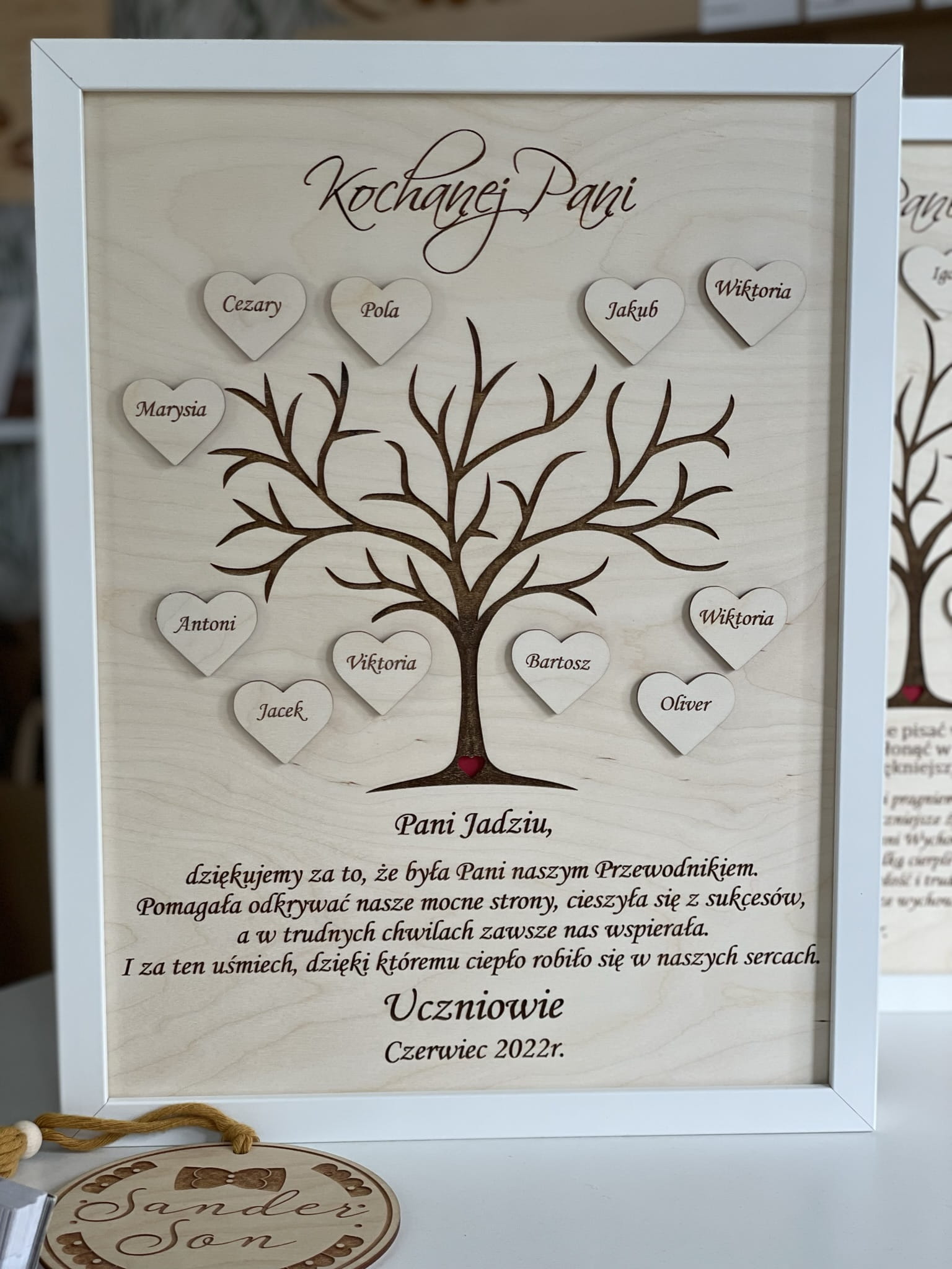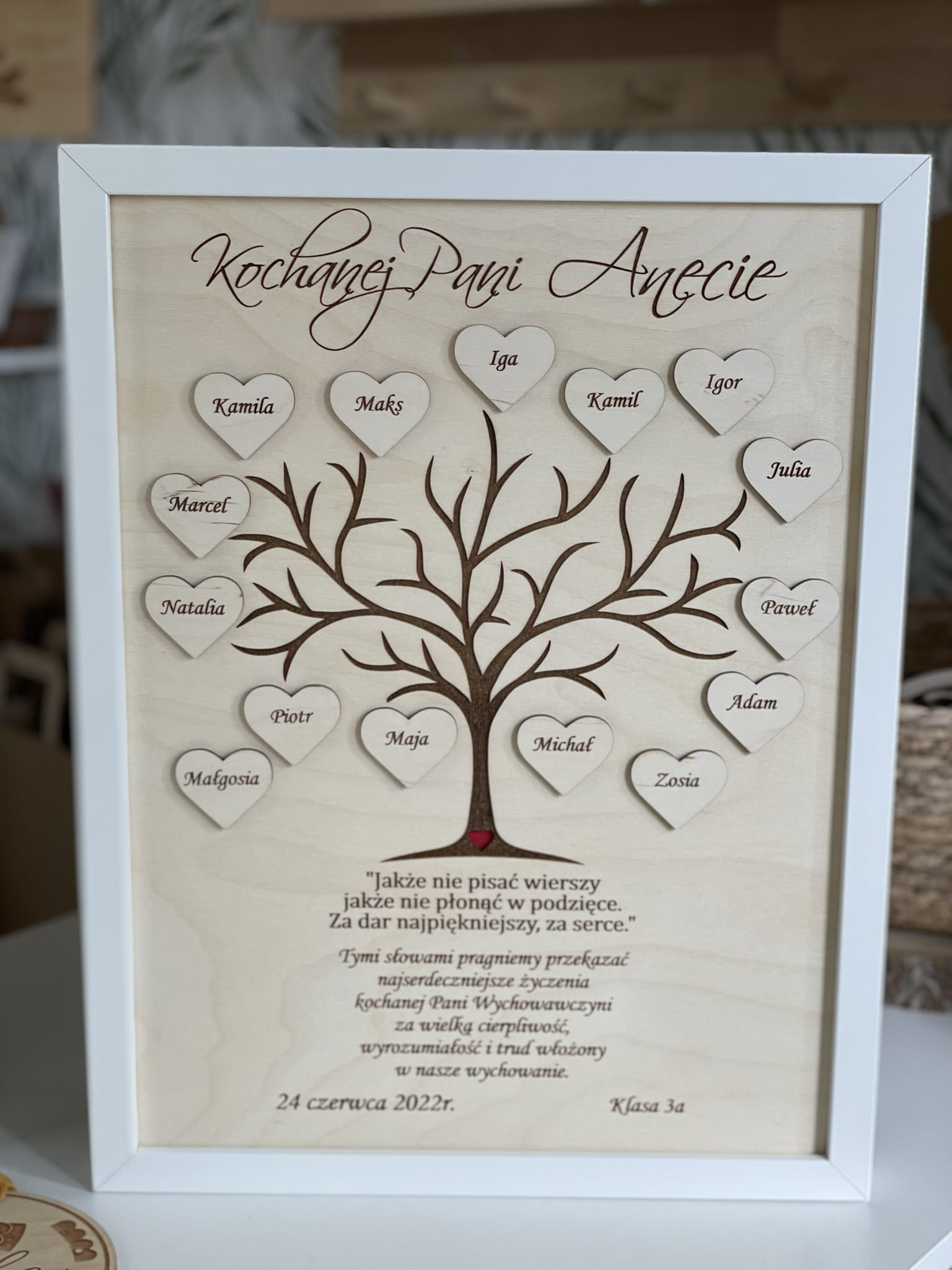 Piękna, grawerowana ramka - z motywem drzewa - z imionami dzieci umieszczonymi na drewnianych, małych serduszkach.