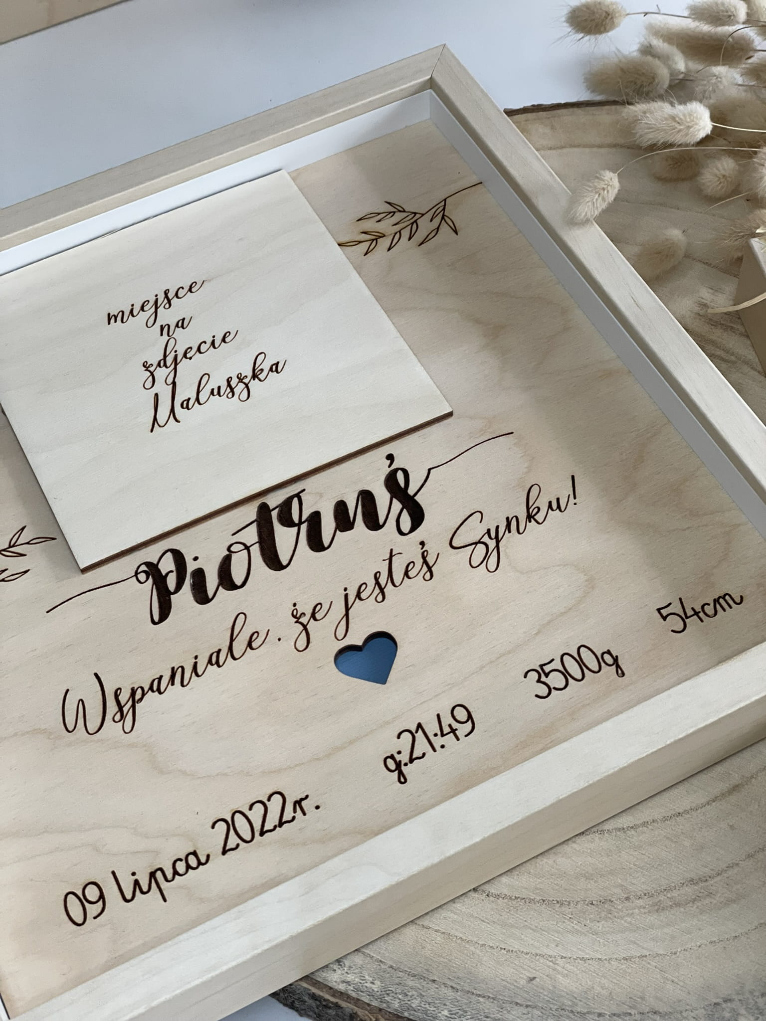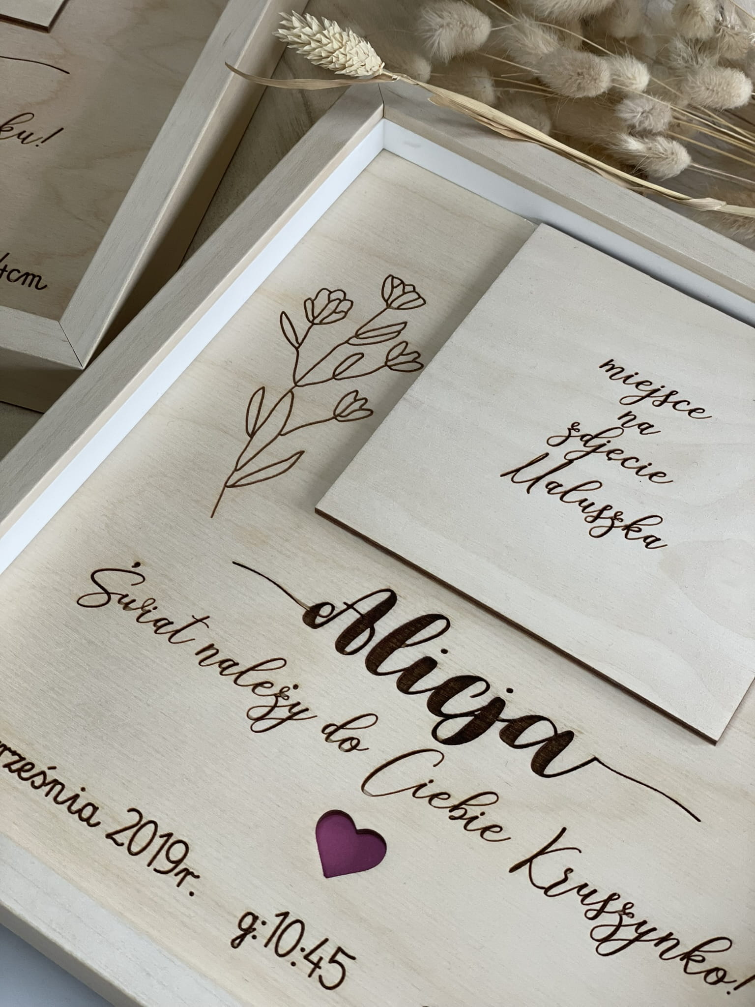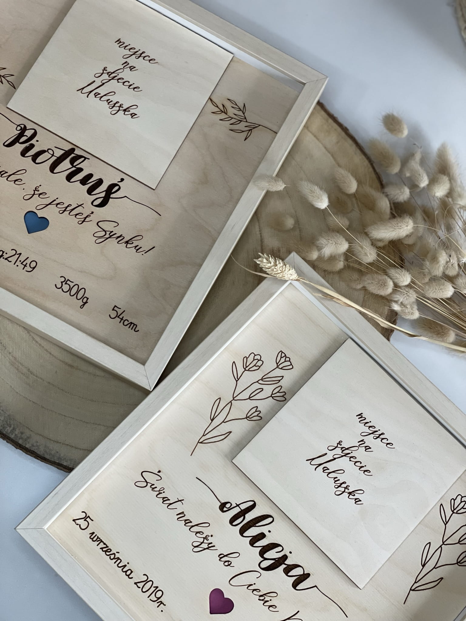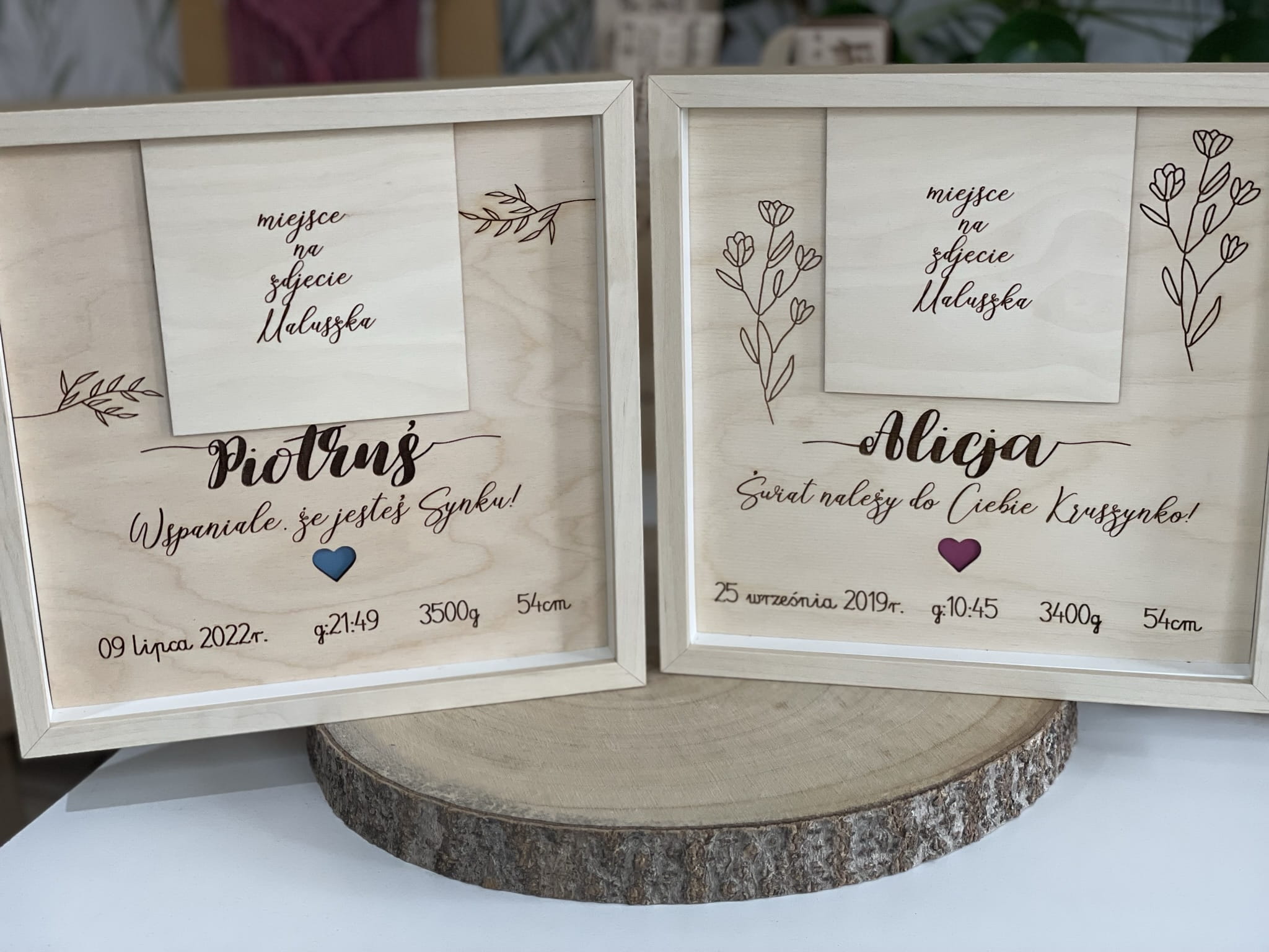 W ramce bowiem jest umieszczona drewniana wkładka z wygrawerowanymi danymi urodzeniowymi dziecka - datą, wzrostem, wagą oraz godziną.
