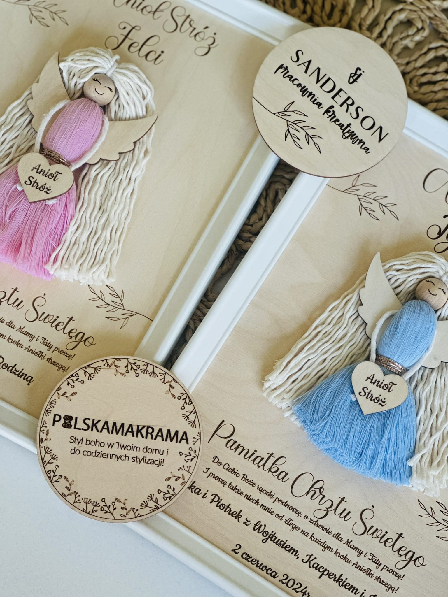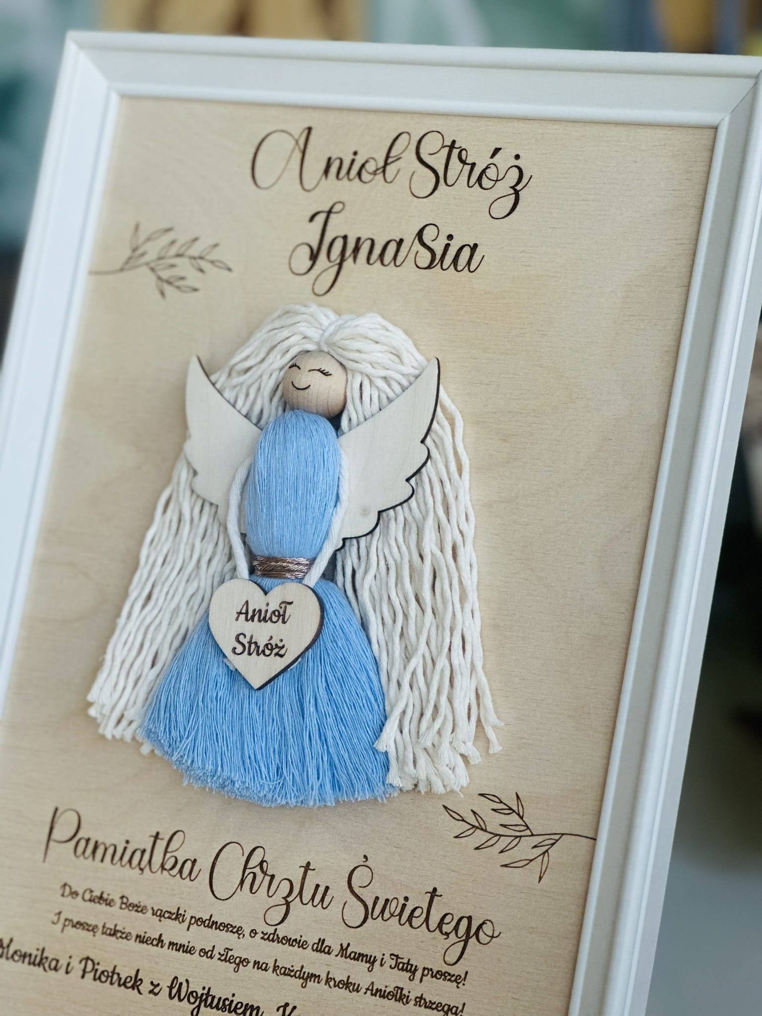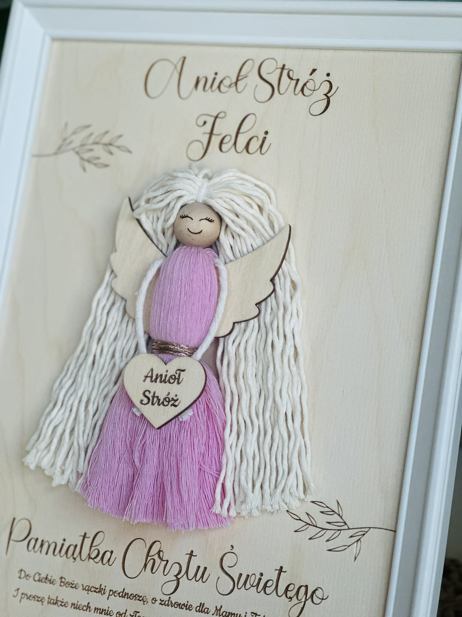 Główną rolę bez dwóch zdań gra Anioł Stróż wykonany ze sznurka w kolorach naturalnych, który jest przyklejony do tabliczki ze sklejki. Aniołek w rękach trzyma serduszko. Na sklejce wygrawerowany jest napis “Anioł Stróż” “Pamiątka Chrztu Świętego” oraz tekst “Do Ciebie Boże rączki podnoszę, o zdrowie dla mamy i taty proszę! I proszę także niech mnie od złego na każdym kroku Aniołki strzegą!”