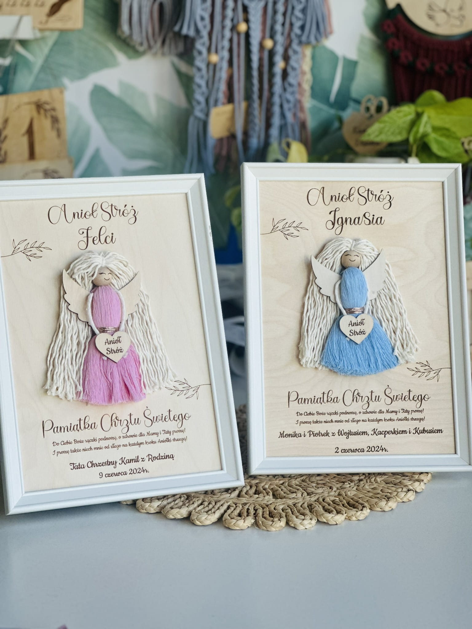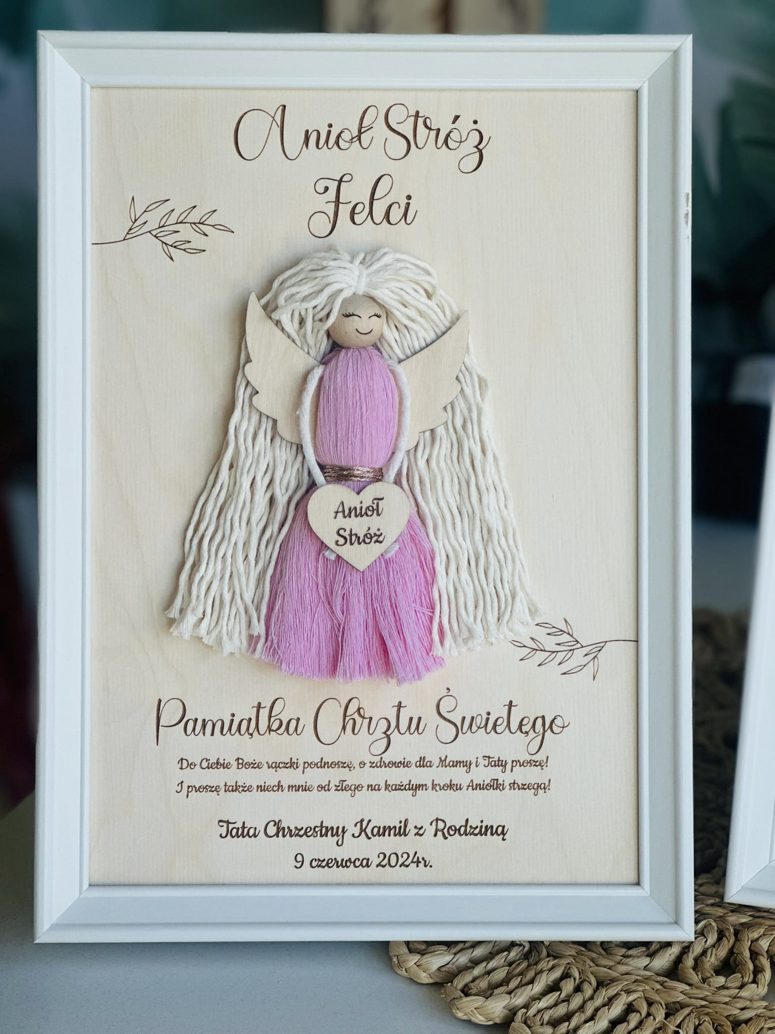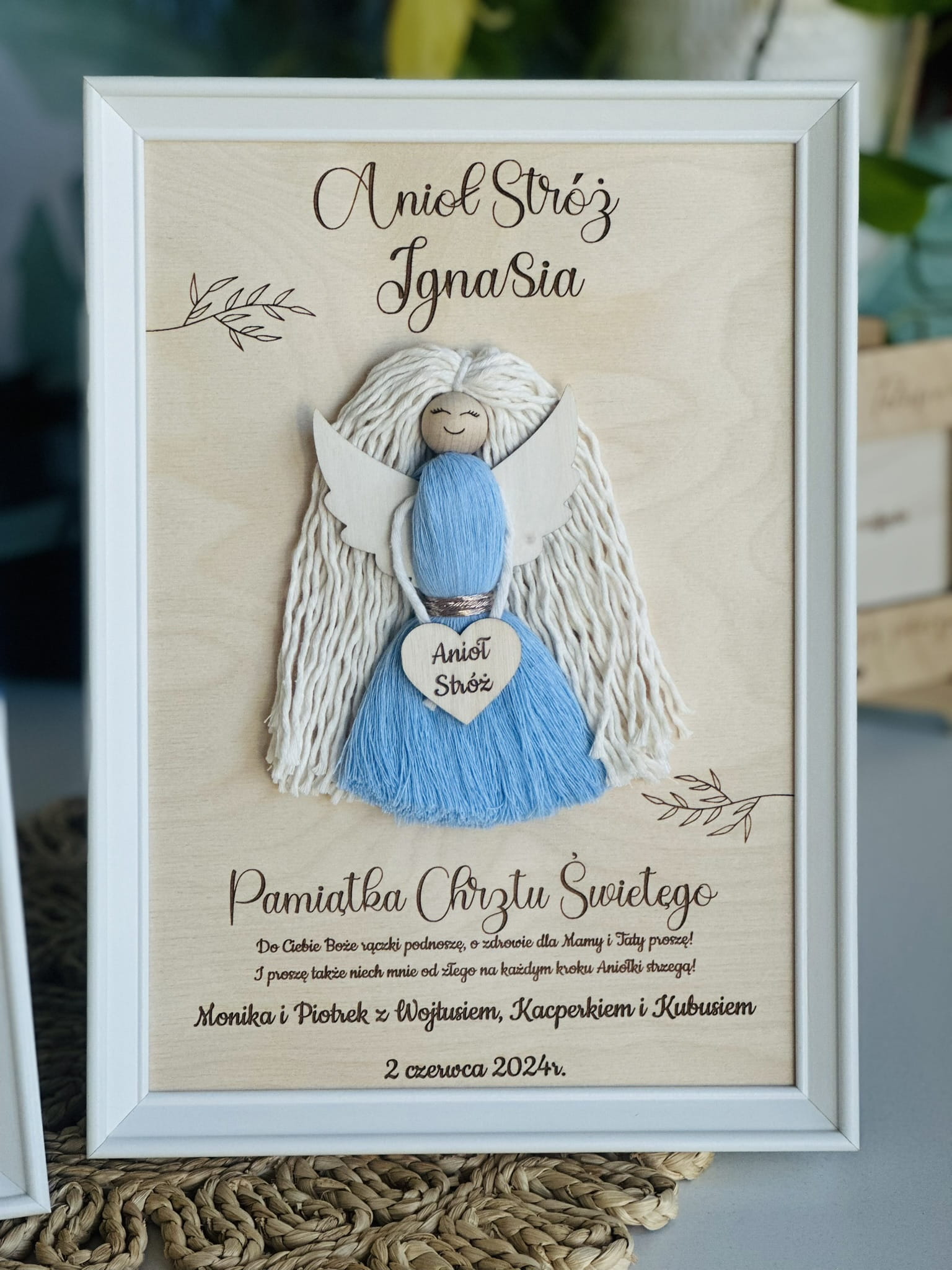 Główną rolę bez dwóch zdań gra Anioł Stróż wykonany ze sznurka w kolorach naturalnych, który jest przyklejony do tabliczki ze sklejki. Aniołek w rękach trzyma serduszko. Na sklejce wygrawerowany jest napis “Anioł Stróż” “Pamiątka Chrztu Świętego” oraz tekst “Do Ciebie Boże rączki podnoszę, o zdrowie dla mamy i taty proszę! I proszę także niech mnie od złego na każdym kroku Aniołki strzegą!”