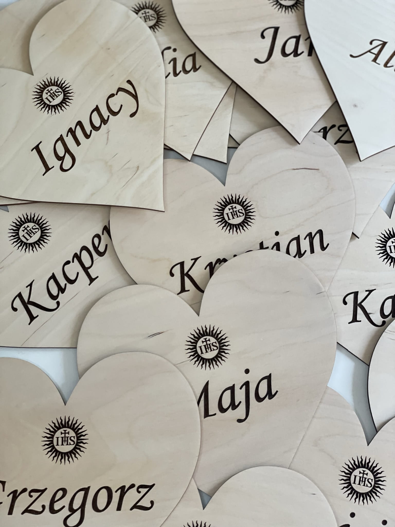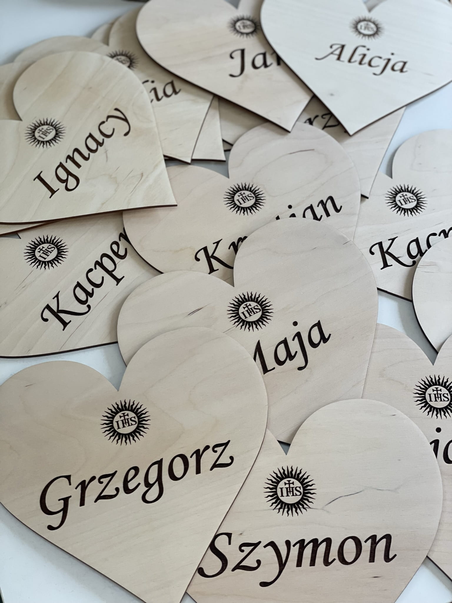 Pamiątka I Komunii Świętej - drewniane serce dla dziecka, pamiątka, jak i również atrybut do sesji zdjęciowych. Z grawerem imienia dziecka, hostią a także możliwością wygrawerowania daty uroczystości.