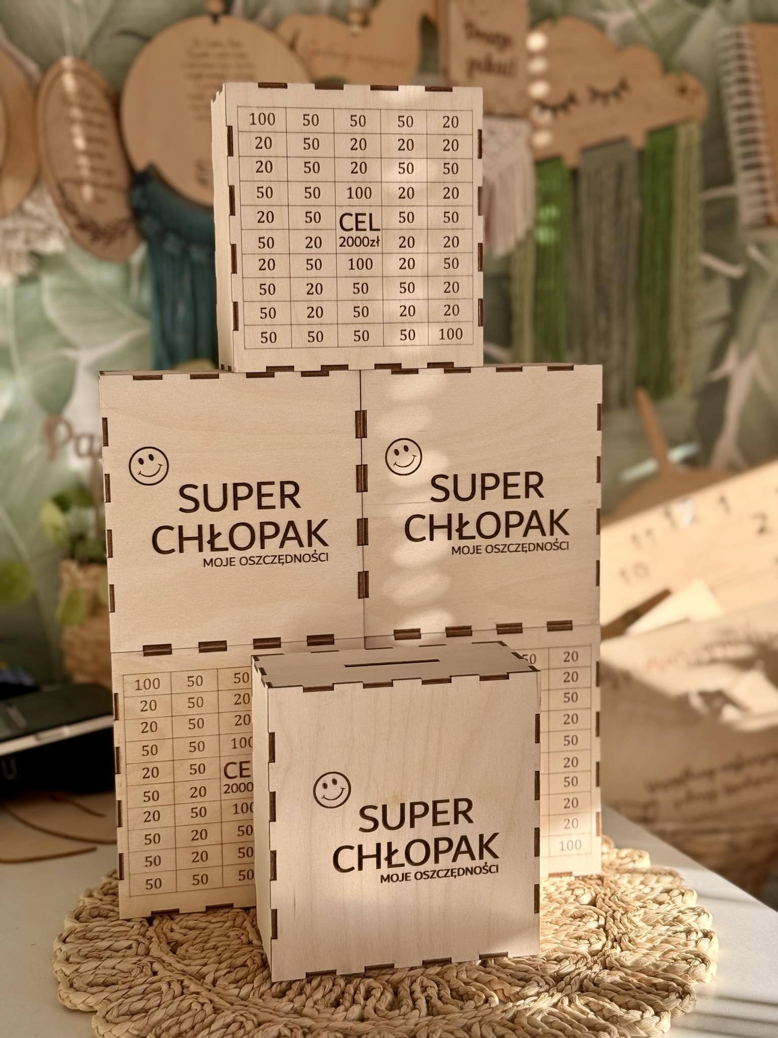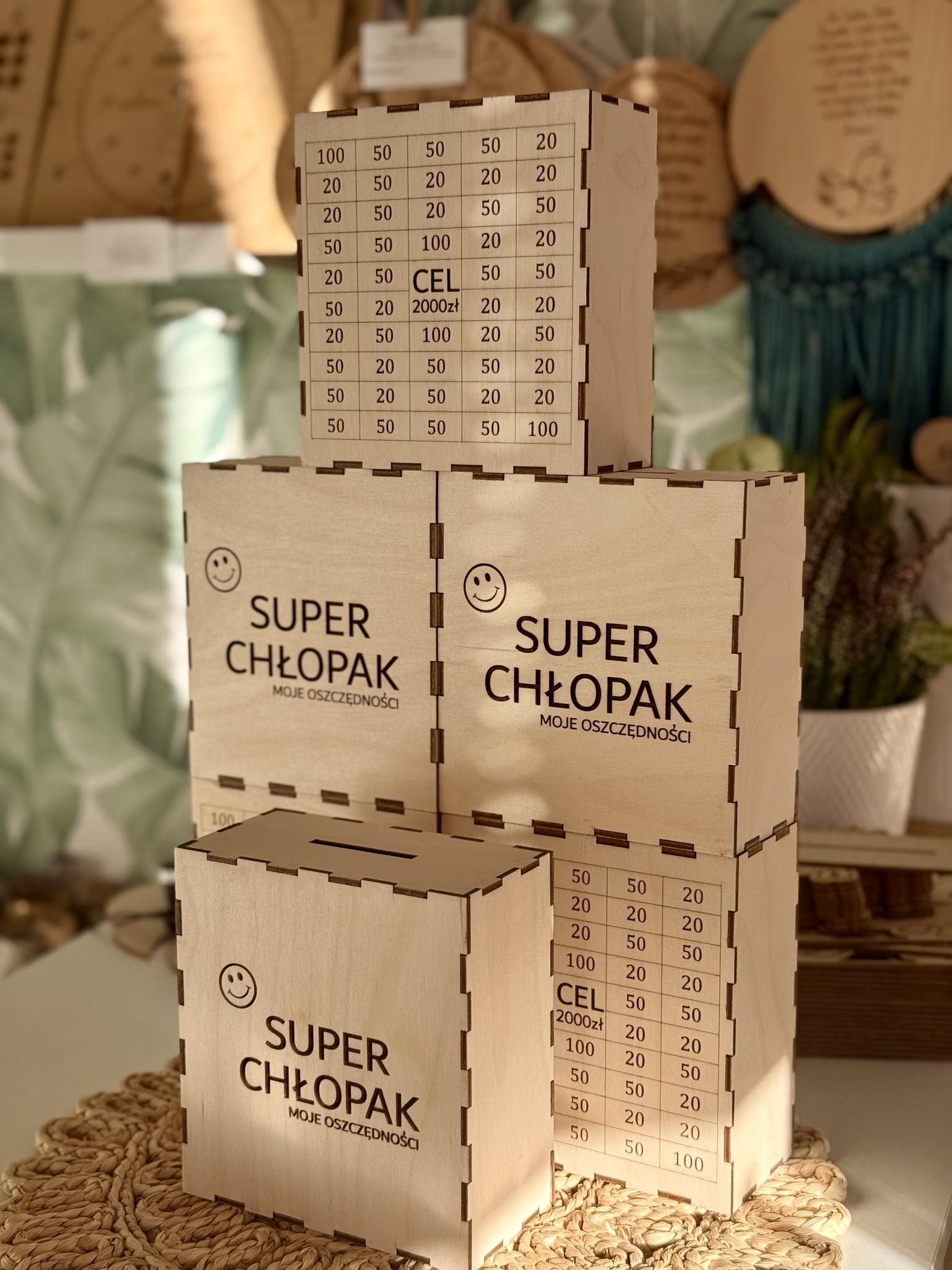 Skarbonka jest dwustronna- z jednej strony wygrawerowana jest wykreślanka z polami do wykreślania a z drugiej grawer - SUPER CHŁOPAK (tu może być wybrane imię) oraz podpis "MOJE OSZCZĘDNOŚCI"