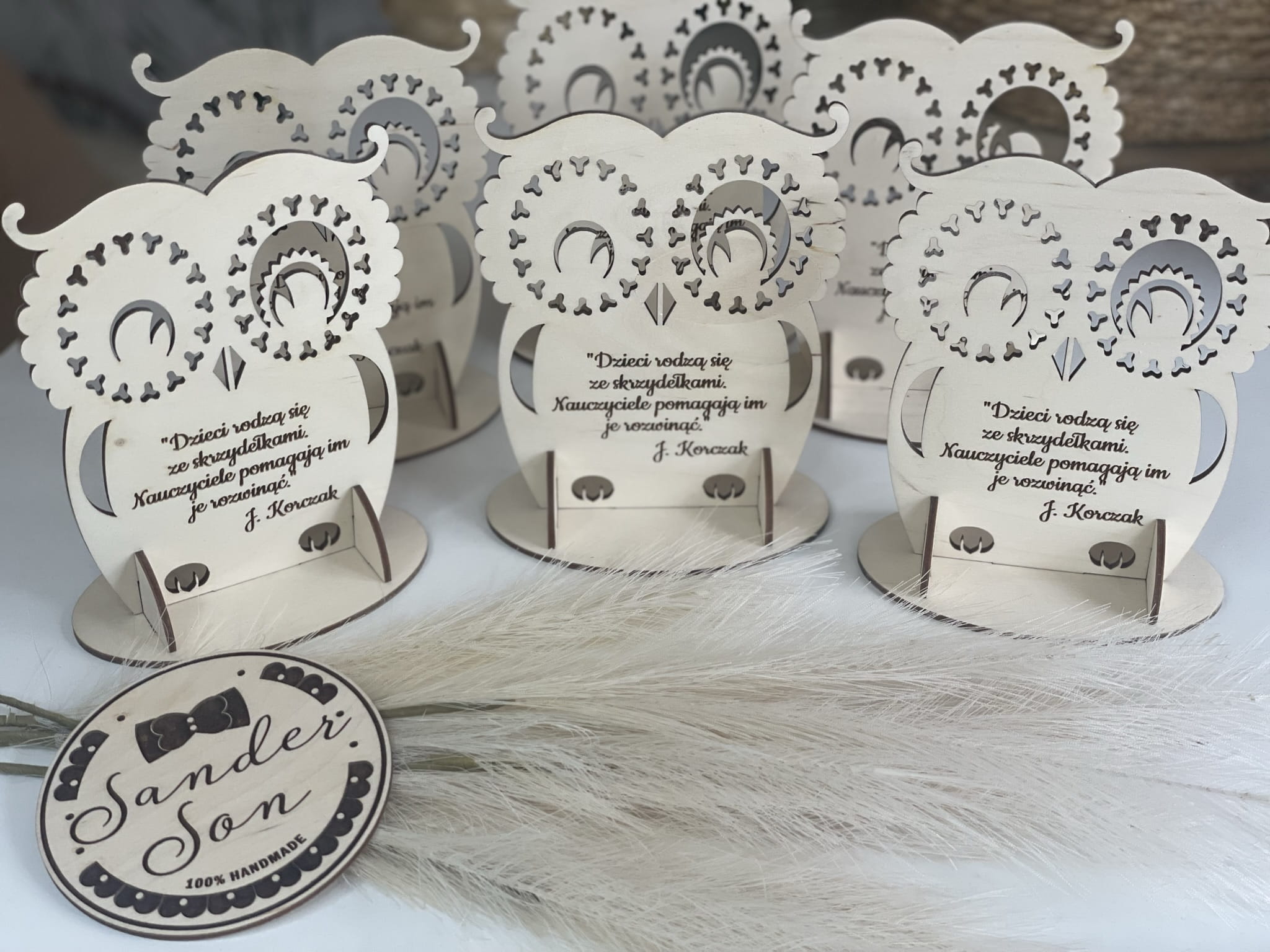 Stojąca sówka - statuetka dla nauczyciela z cytatem oraz wybranym grawerem.
