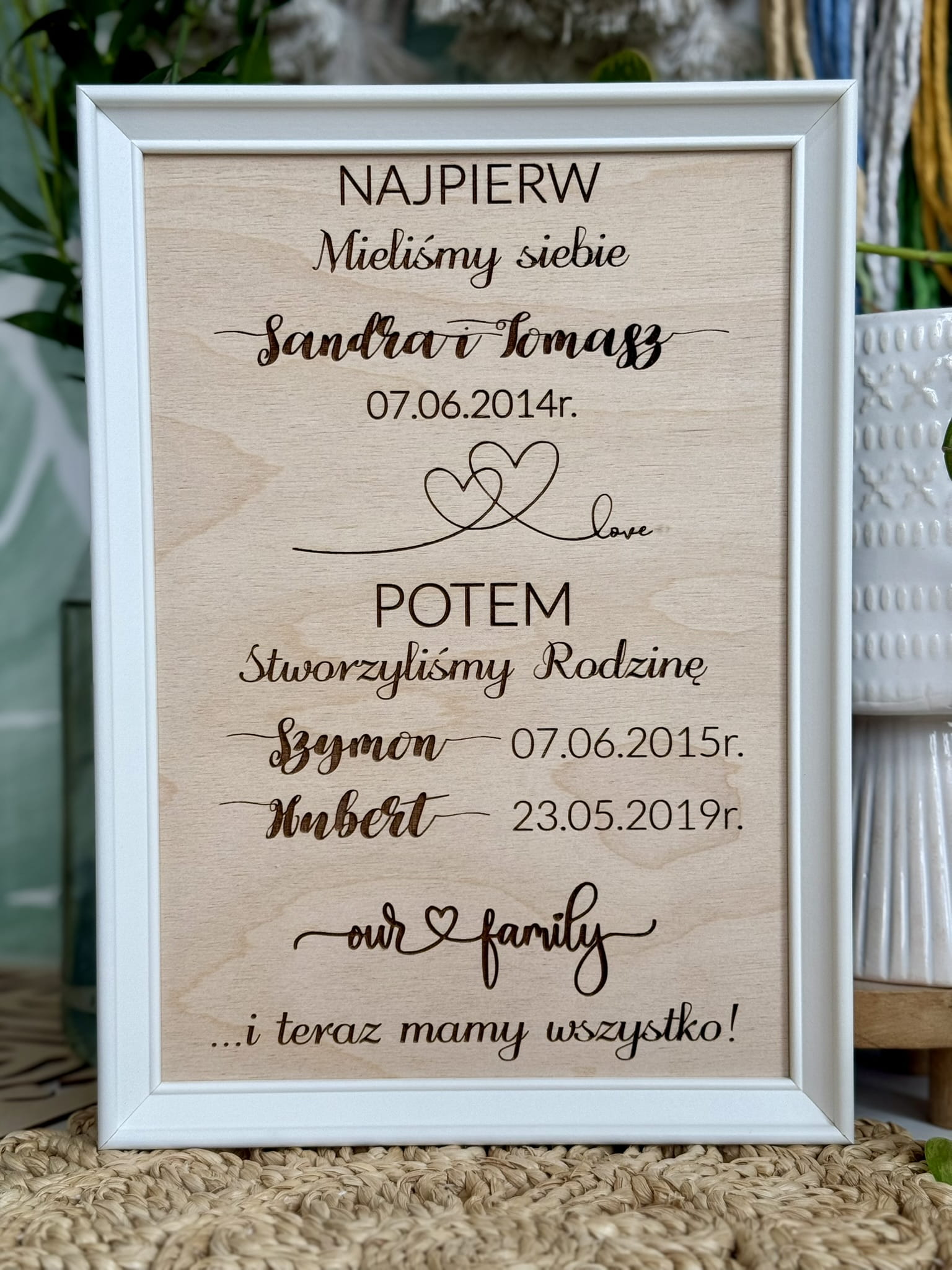 Przepiękna tabliczka z wygrawerowanymi imionami członków Rodziny oraz z ważnymi datami takimi jak Ślub oraz narodziny dzieci.
