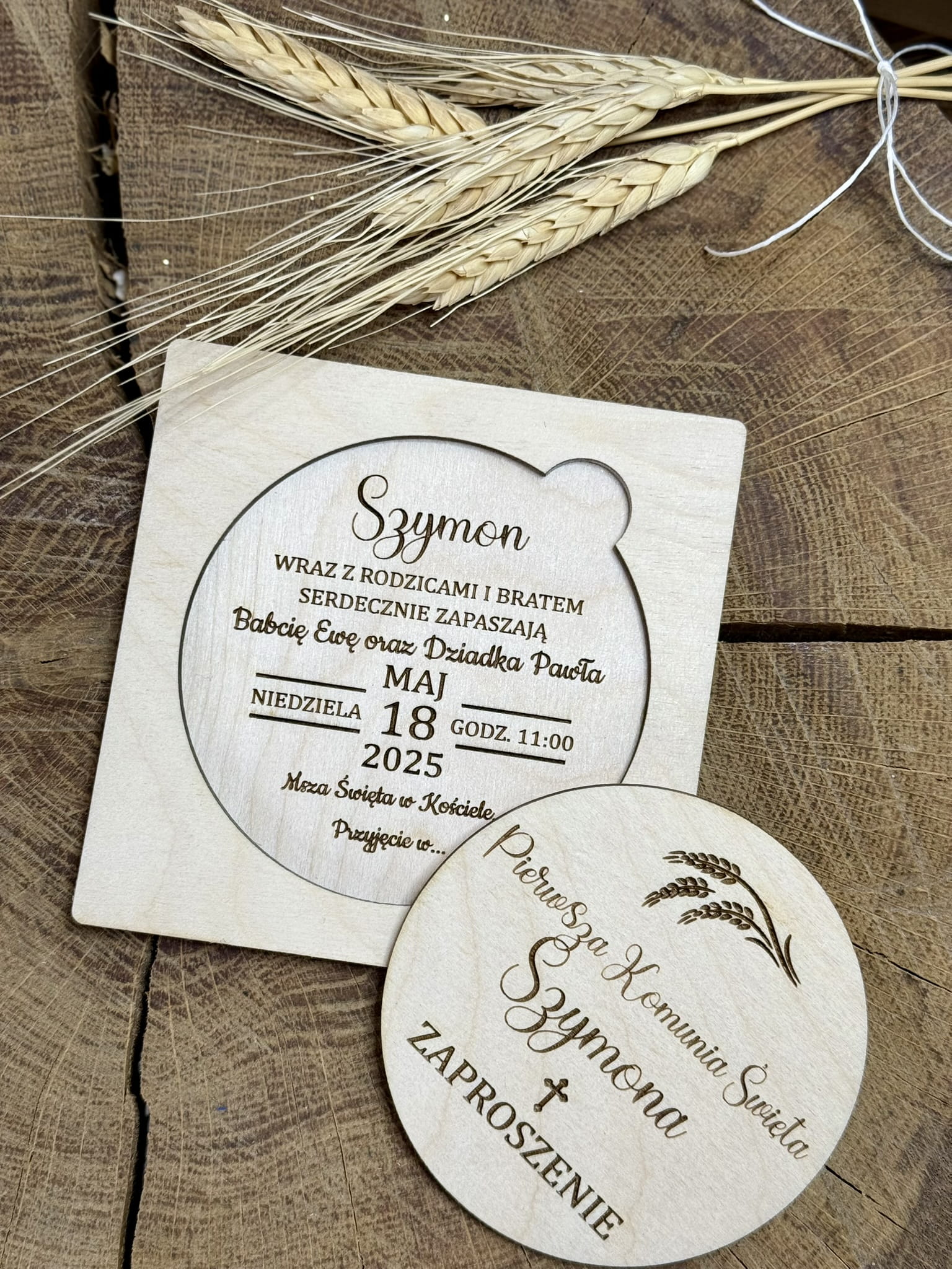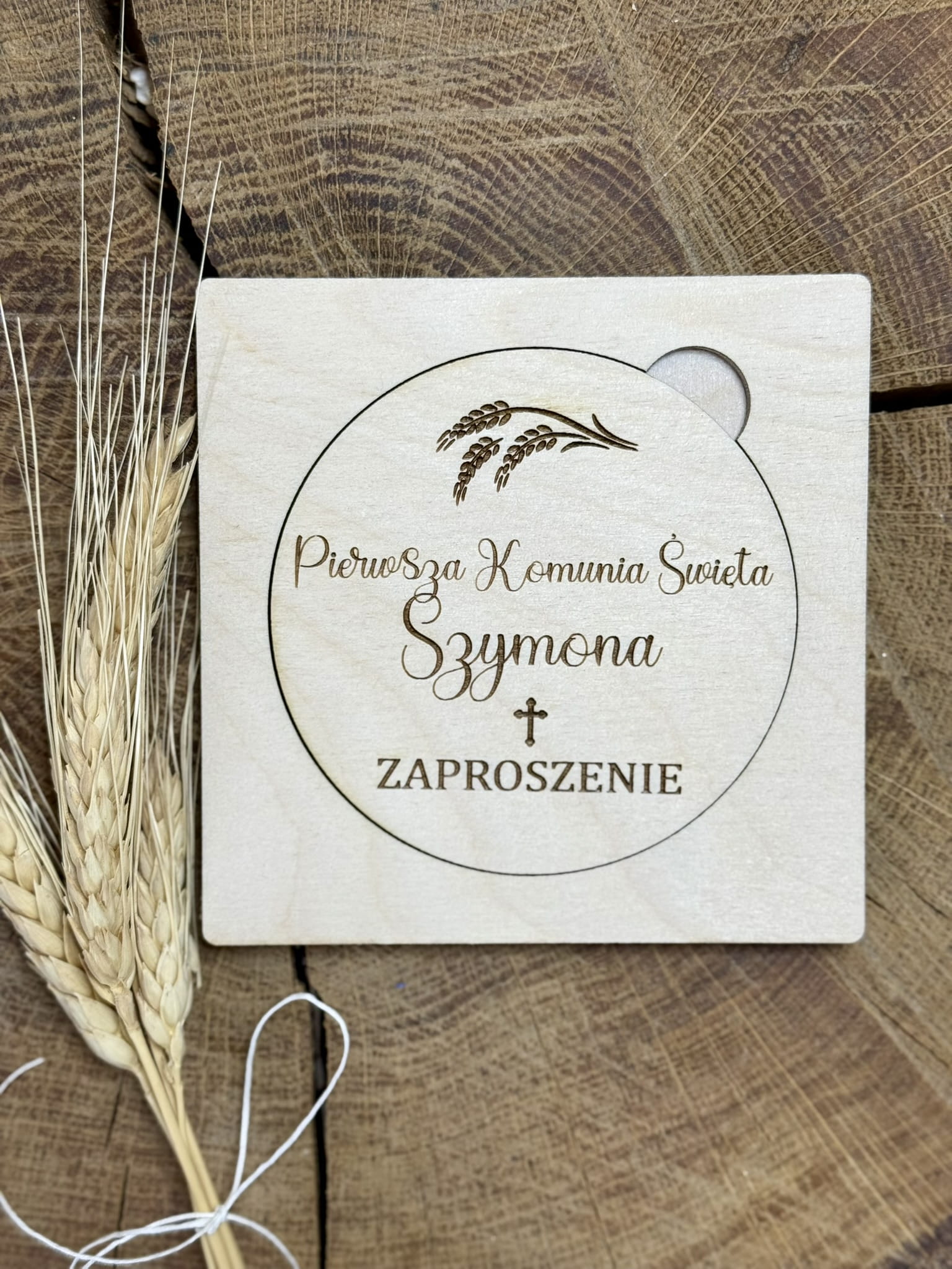 Istnieje możliwość doczepienia drewnianej zawieszki z napisem „Zaproszenie” lub „I Komunia Święta (imię)” w cenie 2 zł/ szt.